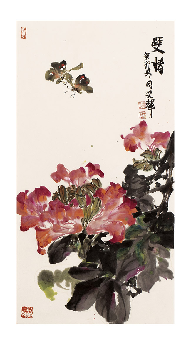 《双情》以蝶恋花之意象,演绎传统题材的当代诠释。玫红花瓣与墨蝶相映成趣,“双情”题旨既指向物象间的相依相存,亦隐喻艺术与自然的对话关系。而《无题花卉》则尽显写意精神,奔放的笔触与斑斓的色彩交织出热带雨林的蓬勃生机,两只蝴蝶翩跹其间,仿佛带领观者步入一个超越时空的秘境。