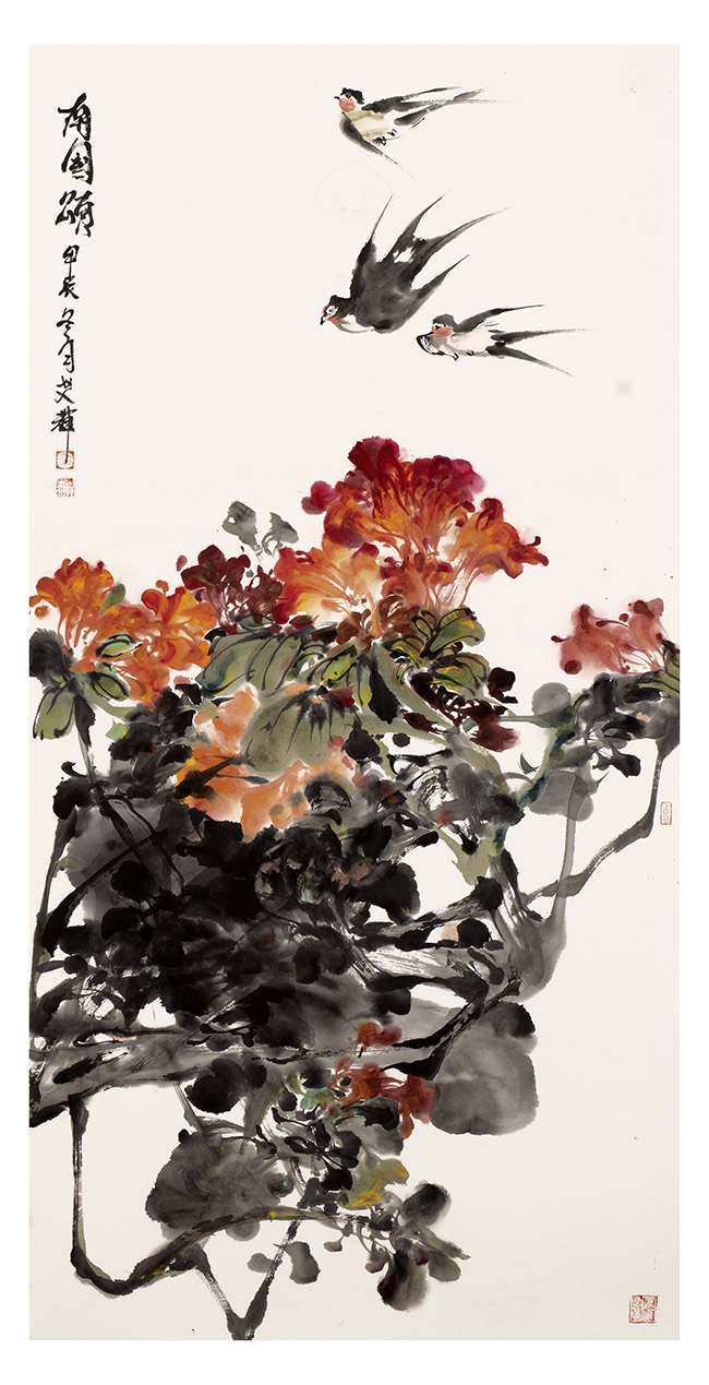 观《南国颂》,但见火焰花团簇如火,三只飞燕掠影成趣,构成动静相宜的韵律。画家以书入画,枝干勾勒如篆籀般遒劲,而花瓣的饱满色块与燕羽的墨韵清透形成奇妙对话,恰似一曲对热带生命的礼赞。背景的淡粉色调柔化了色彩的对比,使画面在热烈中见温润,在浓郁中显空灵。