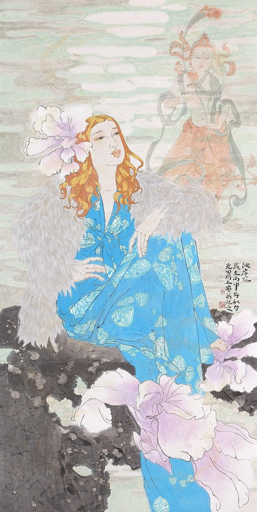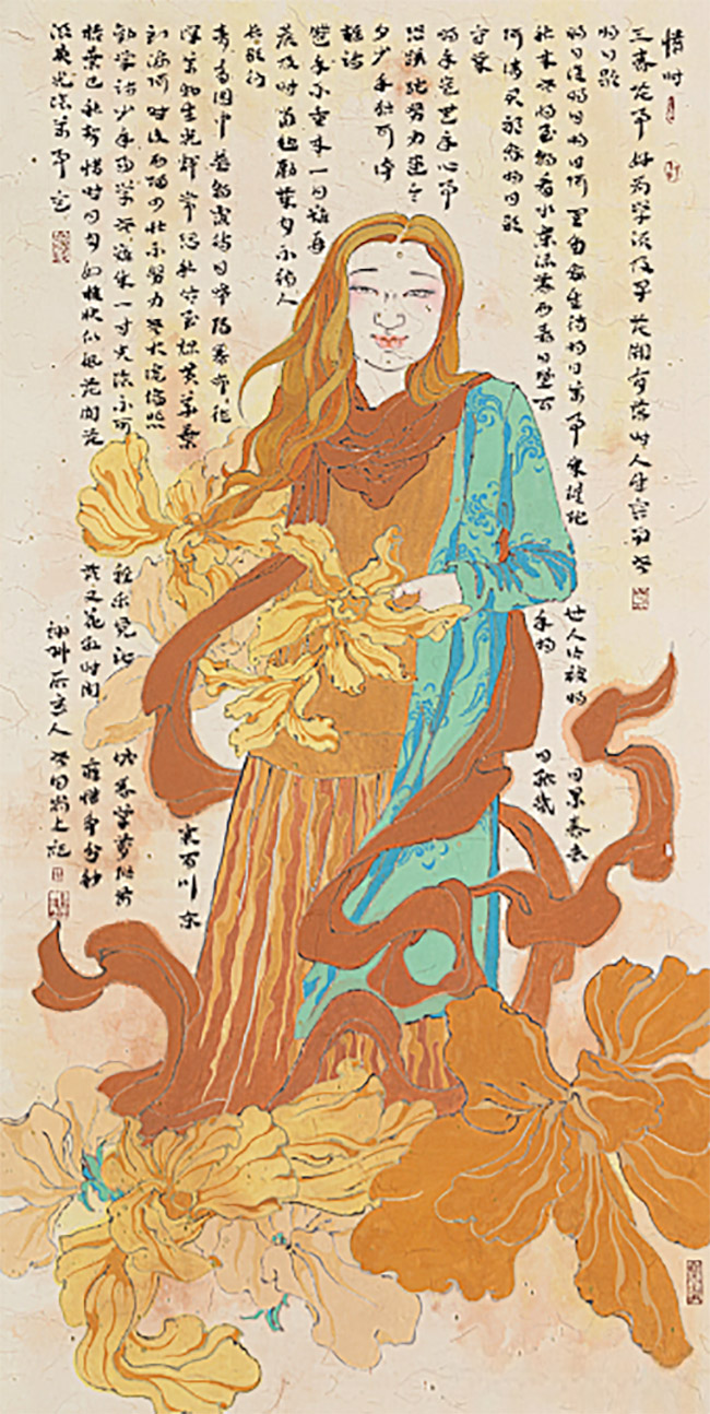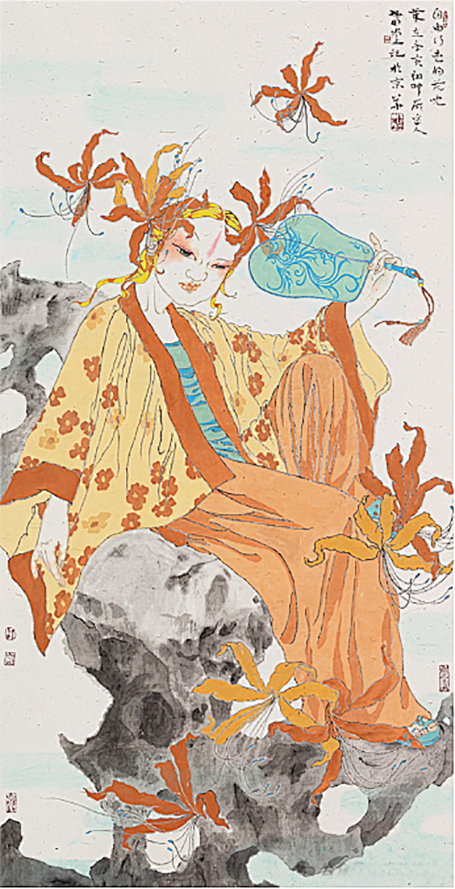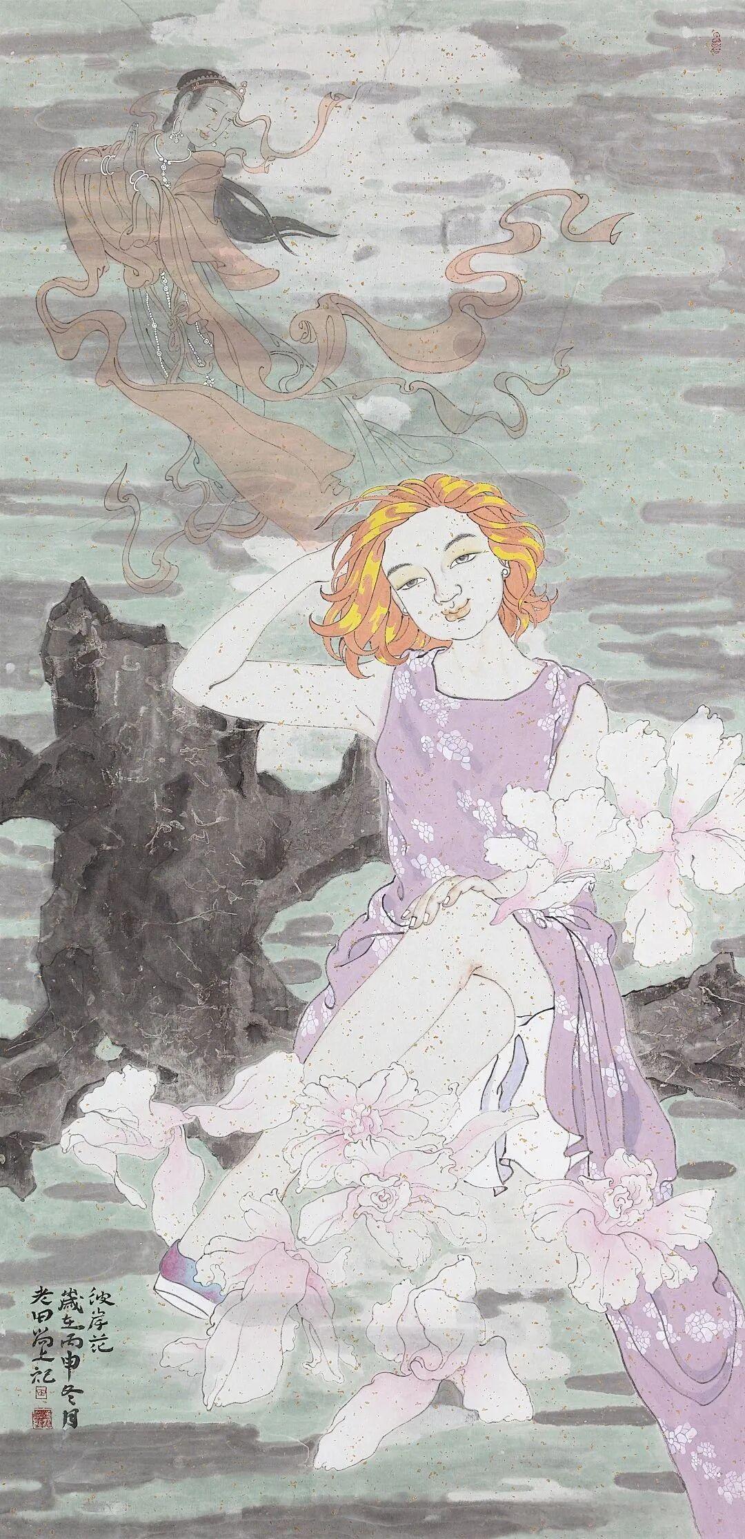 田娟老师的创作常常避熟就生,不以固有的范式去重复自己,她认为不同的体裁,就应该有不同的立意,表现手法上就应当有不同的手段,她的意笔人物画总是在尝试着不同的表现样式。就创作而言,艺术创作的难点有二:一是通过常画的题材,用驾轻就熟的手法反复锤炼笔墨,成就一种属于个人独有的作画方式,用这种属于个人的方式去创作,必然要有独特的、一贯的个人风格。一个画家能形成自己的风格已属不易。难点之二 ,一个画家所创作的作品,应该有每一件作品本身独立的审美价值和独立的艺术生命。通过不同的物象为题材,目的不是再现物象本身,而是通过物象来塑造意象、营造境界,最终是要表达艺术创作者的心声——思想,以及感受、体验、感动和认知态度。这就要求作者不能一成不变,用一种方法反复复制,每一件作品要有新的思绪,新的意味,在大同中有小异。艺术的表现技法必须随物象不同的内涵,不同的意趣,不同的题材,而有不同的手法。应该说没有任何一套既成的技法可以应付所有的创作,或者说,任何一幅创作都要有适合所表现内容的形式来完成。否则就是老调重弹,何来艺术。从田娟老师早期创作的历史人物系列、起舞弄清影系列再到女人花系列,每一个单元都依据不同的体裁去表现、去营造不同的意境。这样就要求画家必须具备应对创作中遇到的各种难题的能力,田娟老师的创作反映出她的原创力和不同凡俗的学术品味。