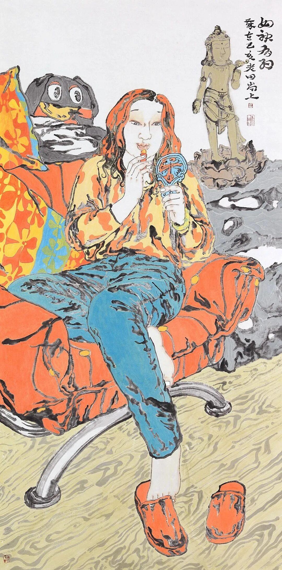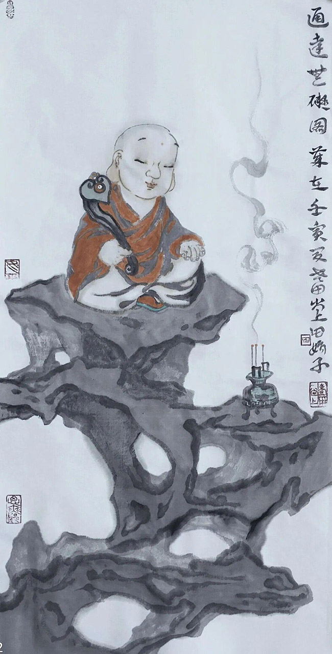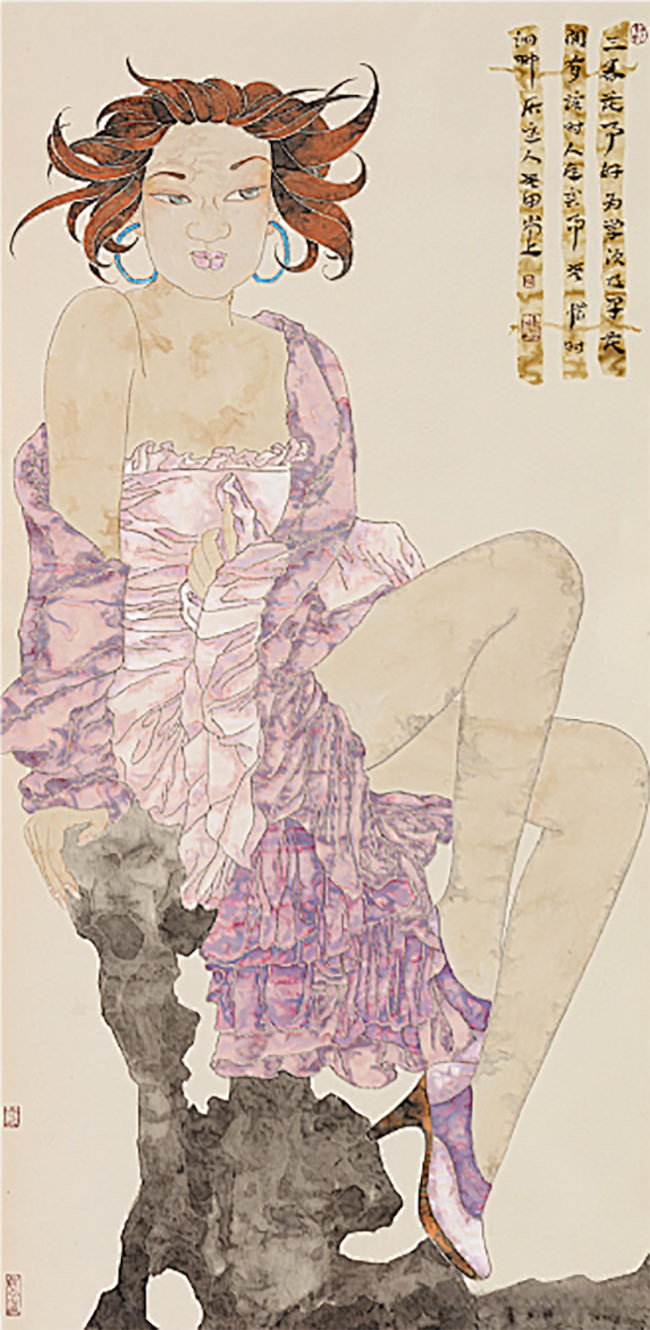 田娟老师的创作常常避熟就生,不以固有的范式去重复自己,她认为不同的体裁,就应该有不同的立意,表现手法上就应当有不同的手段,她的意笔人物画总是在尝试着不同的表现样式。就创作而言,艺术创作的难点有二:一是通过常画的题材,用驾轻就熟的手法反复锤炼笔墨,成就一种属于个人独有的作画方式,用这种属于个人的方式去创作,必然要有独特的、一贯的个人风格。一个画家能形成自己的风格已属不易。难点之二 ,一个画家所创作的作品,应该有每一件作品本身独立的审美价值和独立的艺术生命。通过不同的物象为题材,目的不是再现物象本身,而是通过物象来塑造意象、营造境界,最终是要表达艺术创作者的心声——思想,以及感受、体验、感动和认知态度。这就要求作者不能一成不变,用一种方法反复复制,每一件作品要有新的思绪,新的意味,在大同中有小异。艺术的表现技法必须随物象不同的内涵,不同的意趣,不同的题材,而有不同的手法。应该说没有任何一套既成的技法可以应付所有的创作,或者说,任何一幅创作都要有适合所表现内容的形式来完成。否则就是老调重弹,何来艺术。从田娟老师早期创作的历史人物系列、起舞弄清影系列再到女人花系列,每一个单元都依据不同的体裁去表现、去营造不同的意境。这样就要求画家必须具备应对创作中遇到的各种难题的能力,田娟老师的创作反映出她的原创力和不同凡俗的学术品味。