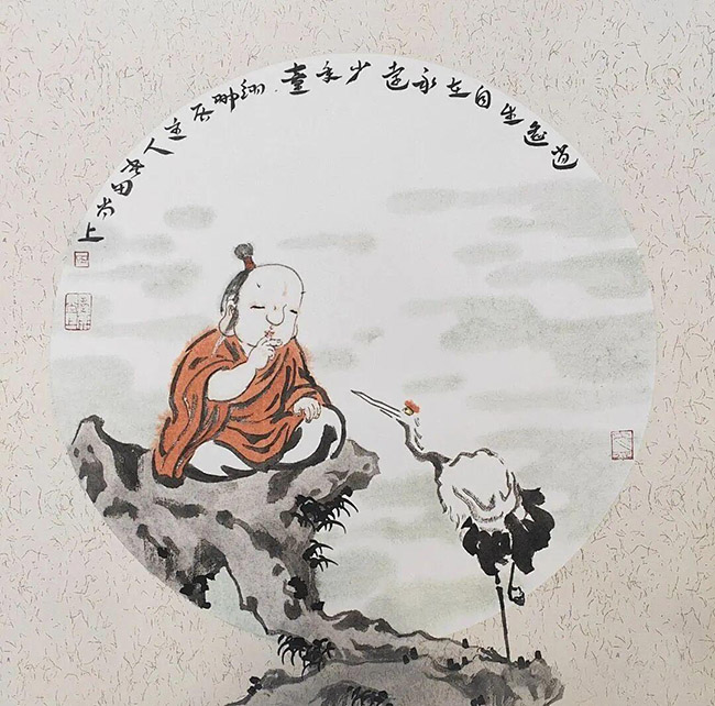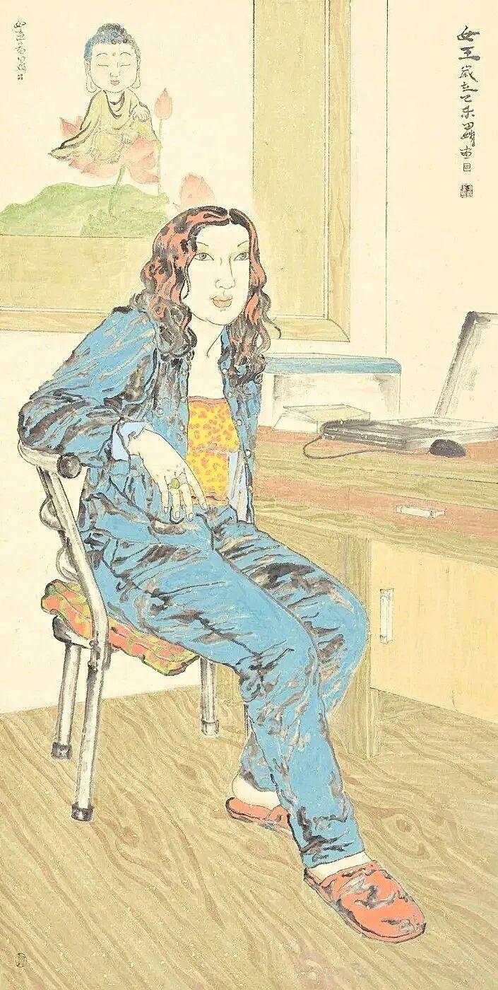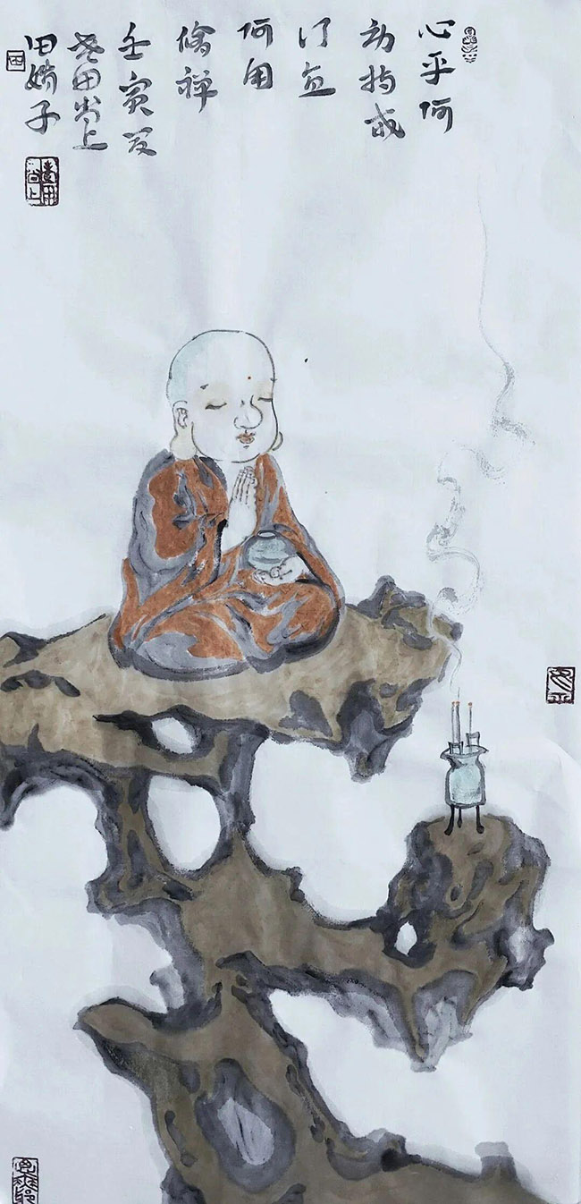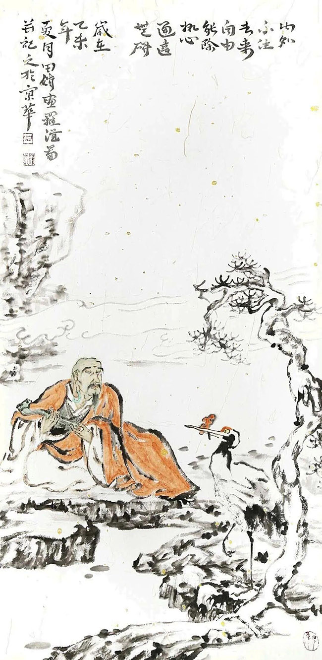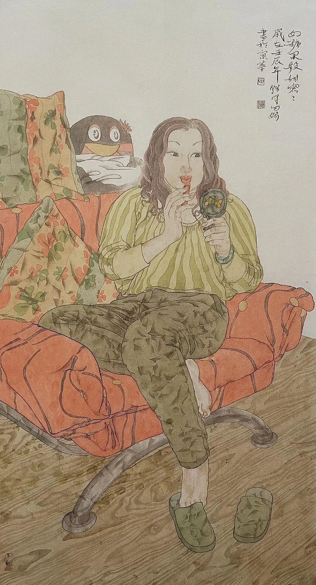 当代人物画家中能够以书入画的屈指可数,不敢染指此道者恐有所忌。一是没有在书法上下过功夫,二是受造型的束缚,单一地追求形准,把形准放在写意的最高的标准位置,至使很多画家沿着这条单一的路径一直走着而忘记中国画的本宗。写意人物画把“写”字放在前面就是突出以书入画。书法之谓艺术在于它的表现性,书法的线条最能表现书者情怀和心性,所谓“书为心画”即是书者通过或飘逸、或沉着、或苦涩、或甜美有一定之规的线来传导书者之情绪的。说它难,还有一点就是即使有一定书法基础的画家,画起人物来也心有余而力不足,遇到造型书法就用不上,可以说这是困扰当代不少有成就人物画家的一道难题。田娟老师的人物画最能体现她以书入画的写意精神。人物造型取之陈老莲,然亦非老莲面目。她的画,线条来自于她的书法,她认为章草更适合意笔的运用,她写的章草书法严格的说还未达至高妙的境地,然而她善于把握章草书之意,以书意入画,这的为画之道,也是她的过人之处吧。