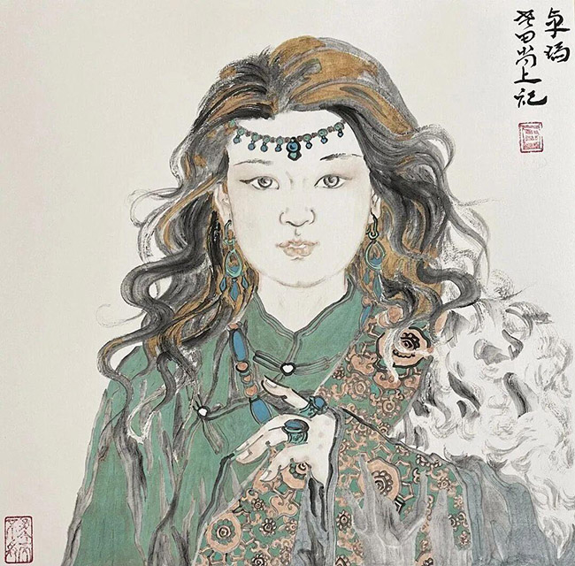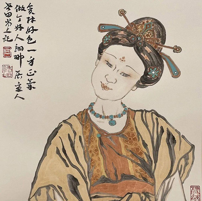田娟老师的人物工笔淡雅,写意古意。这里所说的淡雅是指她创作中的审美取向中的艺术精神,以及造型观念、时空观念、表现技巧等。她把着力点放在意境的创造上,意境是通过想象和联想去追寻象外之旨、韵外之致的。淡雅之旨要在“虚”、“妙”,在把握画面的整体氛围上用力的均衡和笔墨微妙的变化,以使作品升华到一种不受现实物质世界羁绊的更高的精神世界,一种理想的境界,也就是诗的境界,一种没有世俗功利的、纯净的审美境界。田娟的写意人物画有古意,也是她不同于众多人物画家之处。当代许多人物画家画的是古人,表现的是历史体裁,然而,画面却没有丝毫古意。有古意,首先是要有雅逸之趣,质文然后古,有古意然后可传典雅之体面。她的写意人物画突出书写性在于,笔画的起笔、行笔、收笔的一招一式。起笔的提按轻重,行笔的迟速粗细,收笔的连带,皆浑融一气,线条内蕴充实,典雅而有古趣,充满着生命的气息。